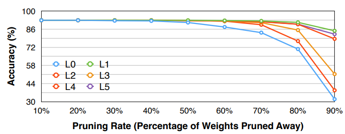 어떤 layer에서는 약간의 pruning만 해도 정확도가 매우 급격하게 떨어지고, 다른 layer에서는 많은 pruning을 해도 정확도가 유지되고 있다.