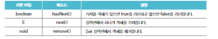 Set 컬렉션 종류는 HashSet, LinkedhashSet, TreeSet등이 있는데 다음은 Set 컬렉션에서 공통적으로 사용가능한 메서드 이다.