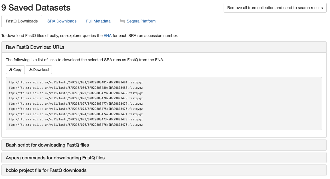 데이터를 다운받는 방법은 여러 가지가 있지만, 저는 Raw FastQ Download URLs를 이용한 방법을 선호합니다.