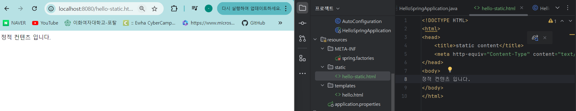 resources/static에 hello-static.html 파일 작성하고 빌드한 뒤, localhost8080/hello-static.html 접속하기
