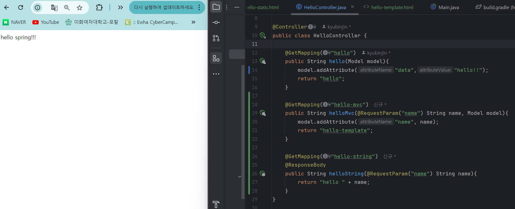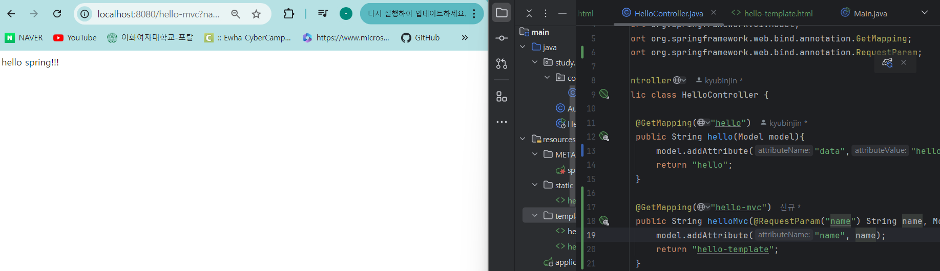 HelloController에 코드 추가하고 빌드한 뒤, localhost8080/hello-mvc?name=spring!!! 접속하면 화면에 hello spring!!! 나타남