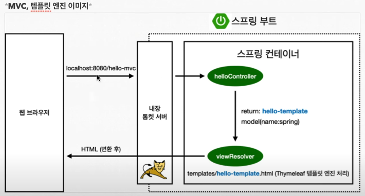 1. 웹브라우저에서 localhost:8080에 hello-mvc 넘기면, 스프링부트 띄울 때 같이 띄우는 내장 톰켓 서버 먼저 거침