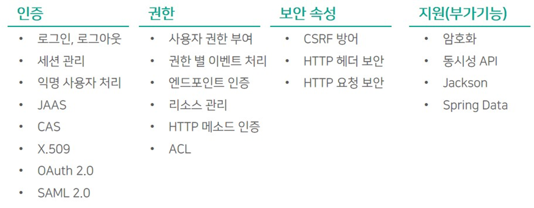 • Spring Security => 이러한 프로세스 간소화하여 구현할 수 있는 풍부한 기능 제공