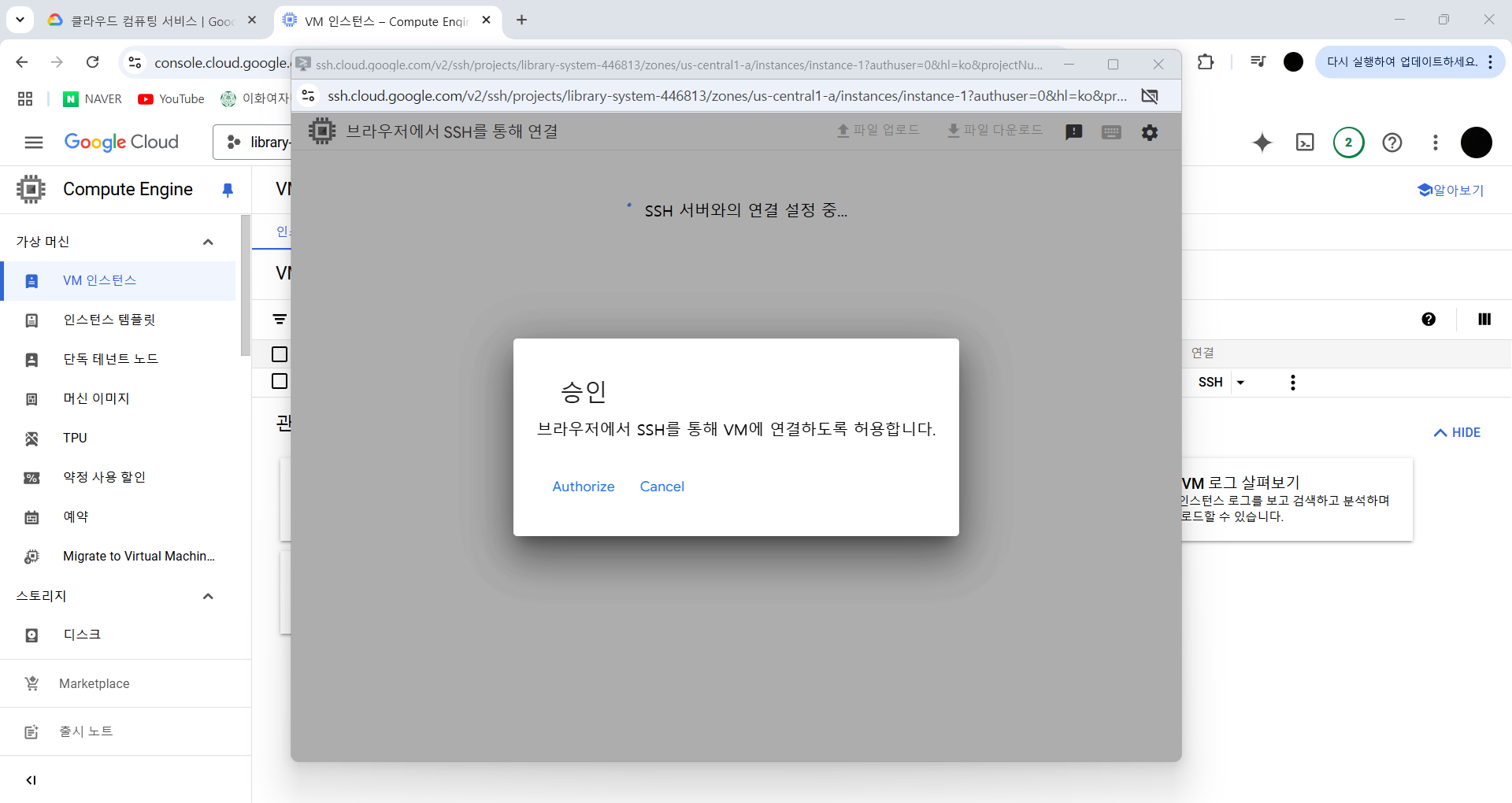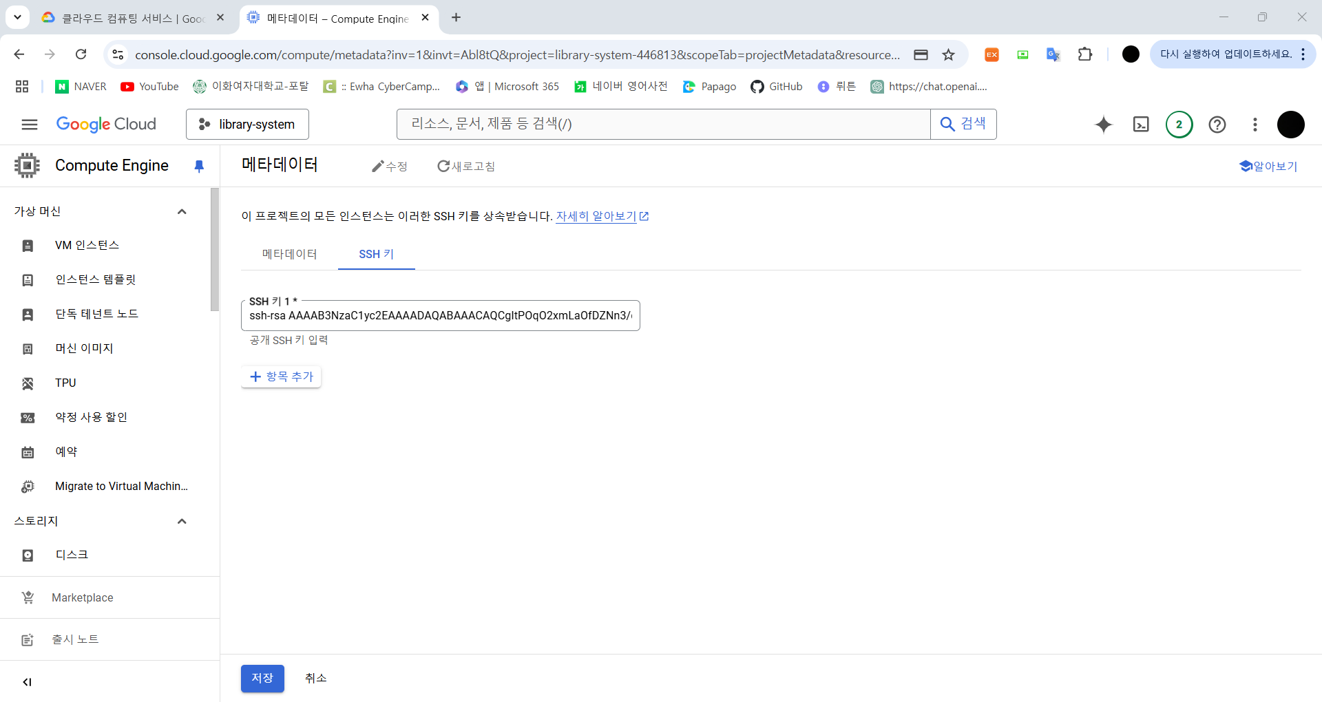 Compute Engine의 메타데이터 들어가서 SSH 키 저장