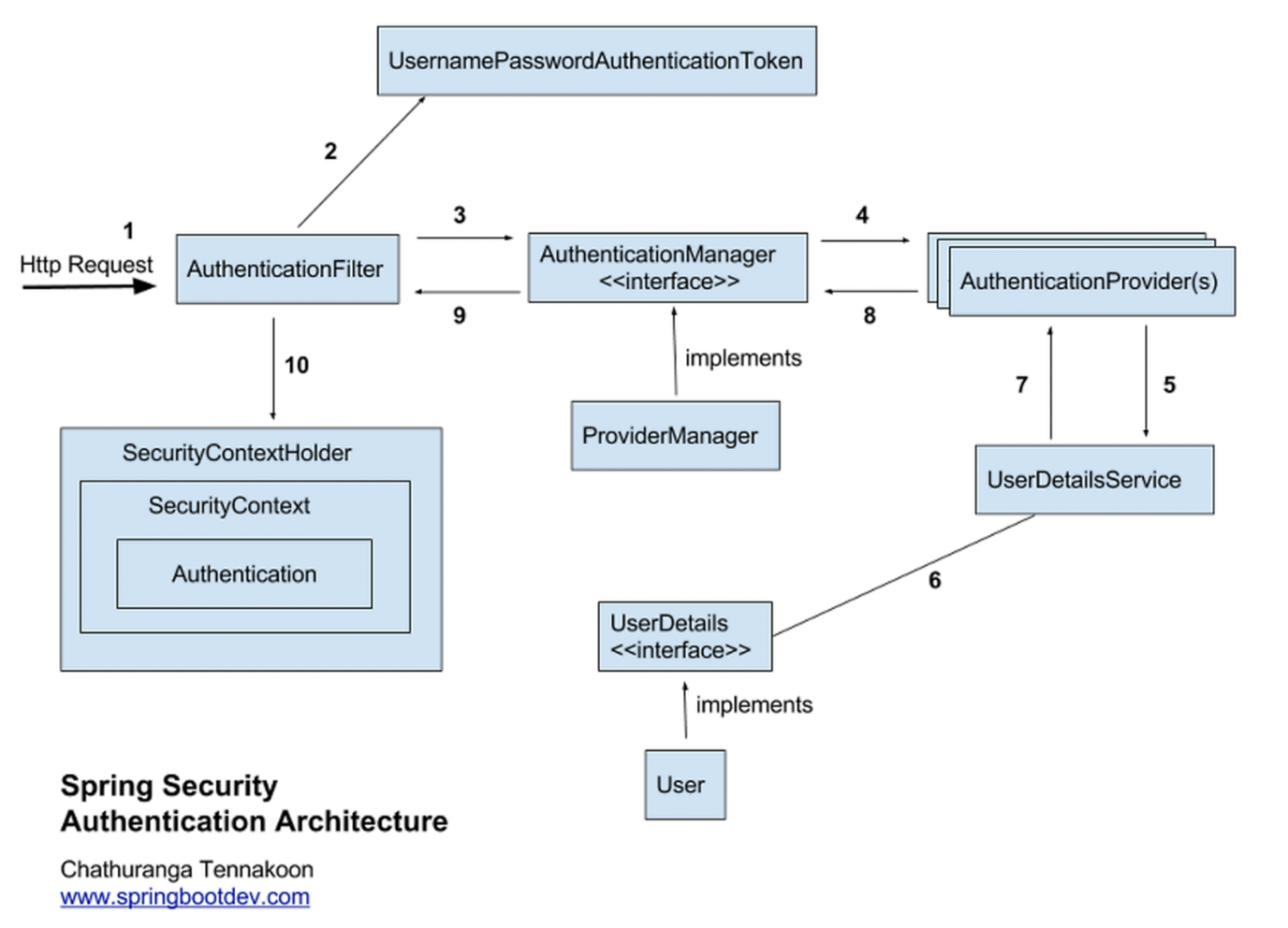 7) User 객체의 정보들을 UserDetails가 UserDetailsService로 전달, AuthenticationProvider들은 UserDetails 넘겨받고 사용자 정보 비교