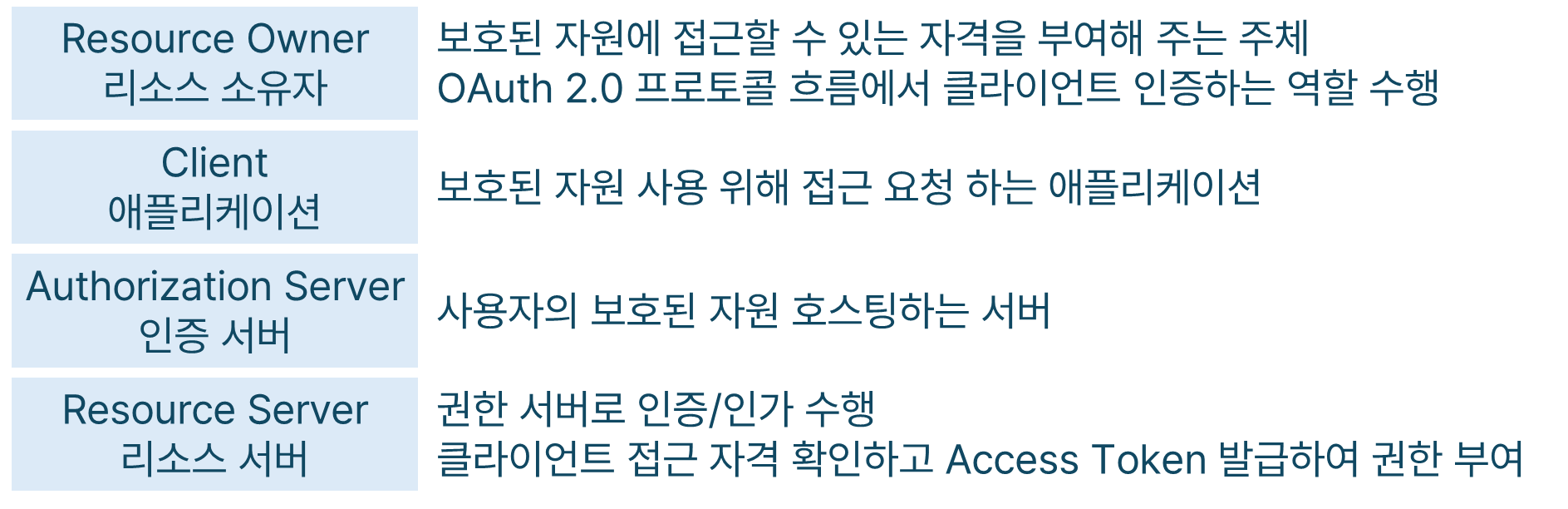 ◦ third-party 프로그램(구글, 카카오 등)에게 로그인 및 개인정보 관리에 대한 권한 위임하여 third-party 프로그램이 가지고 있는 사용자에 대한 리소스 조회 가능