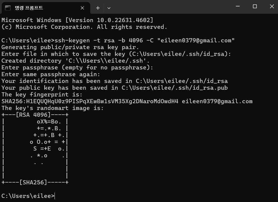 윈도우 터미널 열어서 SSH 키 쌍 생성