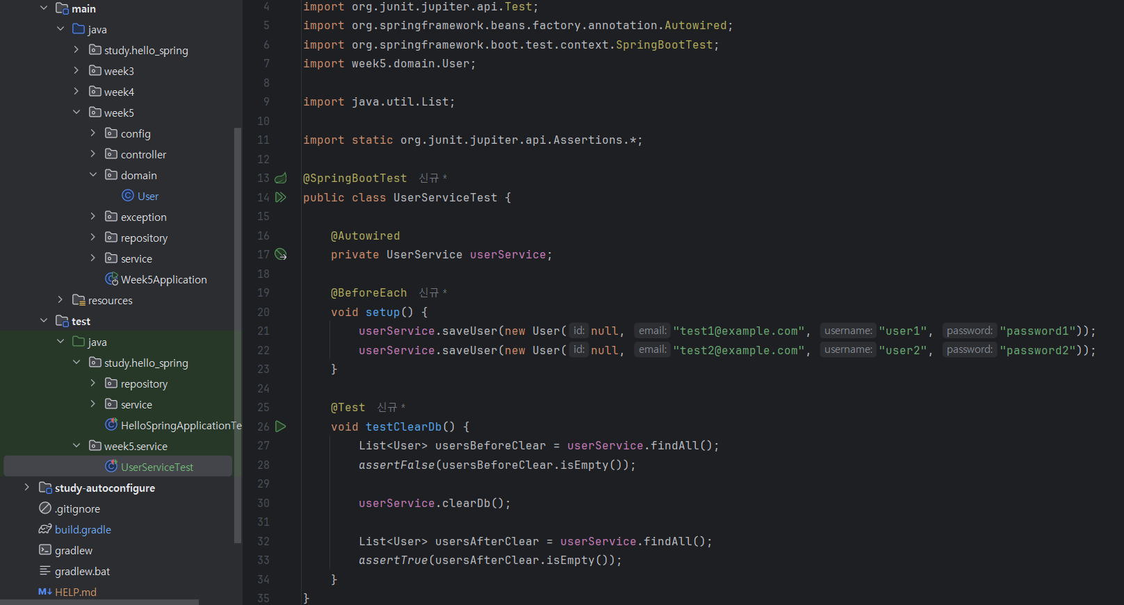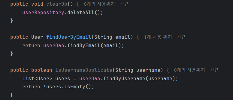 DB 비우는 코드, email로 유저 찾는 코드, 닉네임 중복 여부 확인 코드 작성