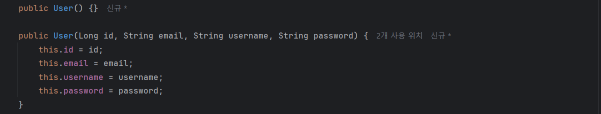 오류가 나서 domail/User에 기본 생성자 & 모든 필드 초기화하는 생성자 추가하여 해결