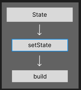 setState를 활용하여 위젯 상태를 변경하는 경우의 라이프사이클은 아주 간단하다. 우선 선언된 setState함수가 실행되면서 상태의 값이 변경되고, 그 값들을 빌드한다.