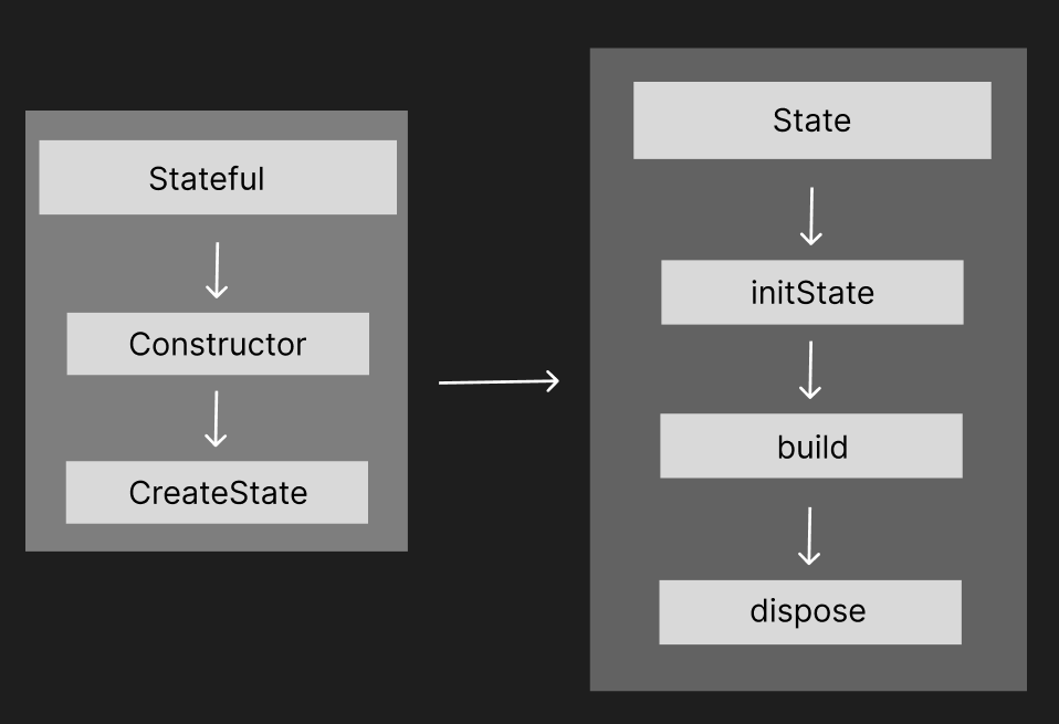 먼저 Stateful에서 Constructor로 위젯을 생성하고, createState를 통해 State라는 위젯을 안에다가 새롭게 만들어준다. 이후에 State에서는 initState로 초기에 한 번 셋팅을 처리하고 build작업에 들어간다. 이후에 원한다면 dispose. 삭제되는 과정으로 생명주기가 진행된다.