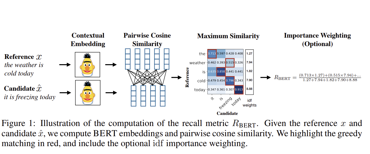 - Recall: Reference x의 각 토큰 x^i에 대해 Candidate x^의 모든 token 중에서 가장 유사한 토큰 x^j를 찾음.