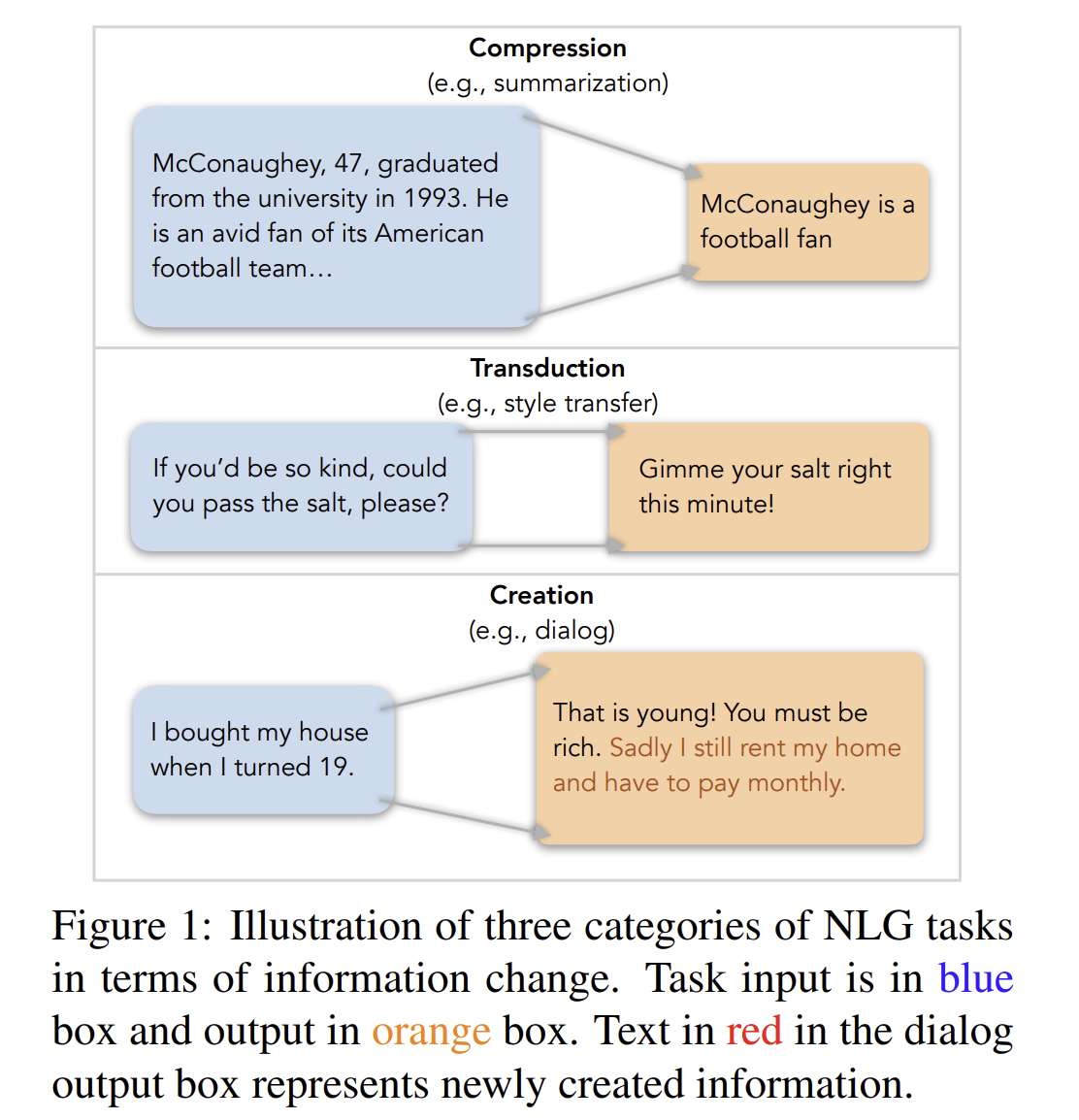 : Input의 Top에 New information이 추가된 Output을 생성함. Ouput, Input, 외부 소스 간의 Information alignment은 본질적으로 어떻게 생성된 Content가 문맥과 잘 어울리는지, Content가 외부 소스에 grounding하여 얼마나 의미 있는 내용인지에 대해 평가함.