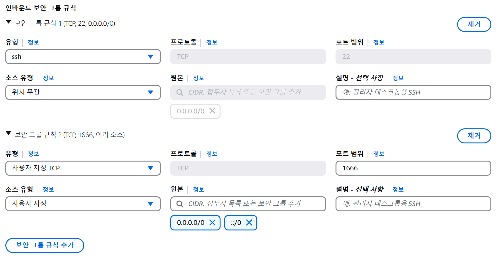 보안 그룹 규칙을 아래와 같이 추가해 줍니다.