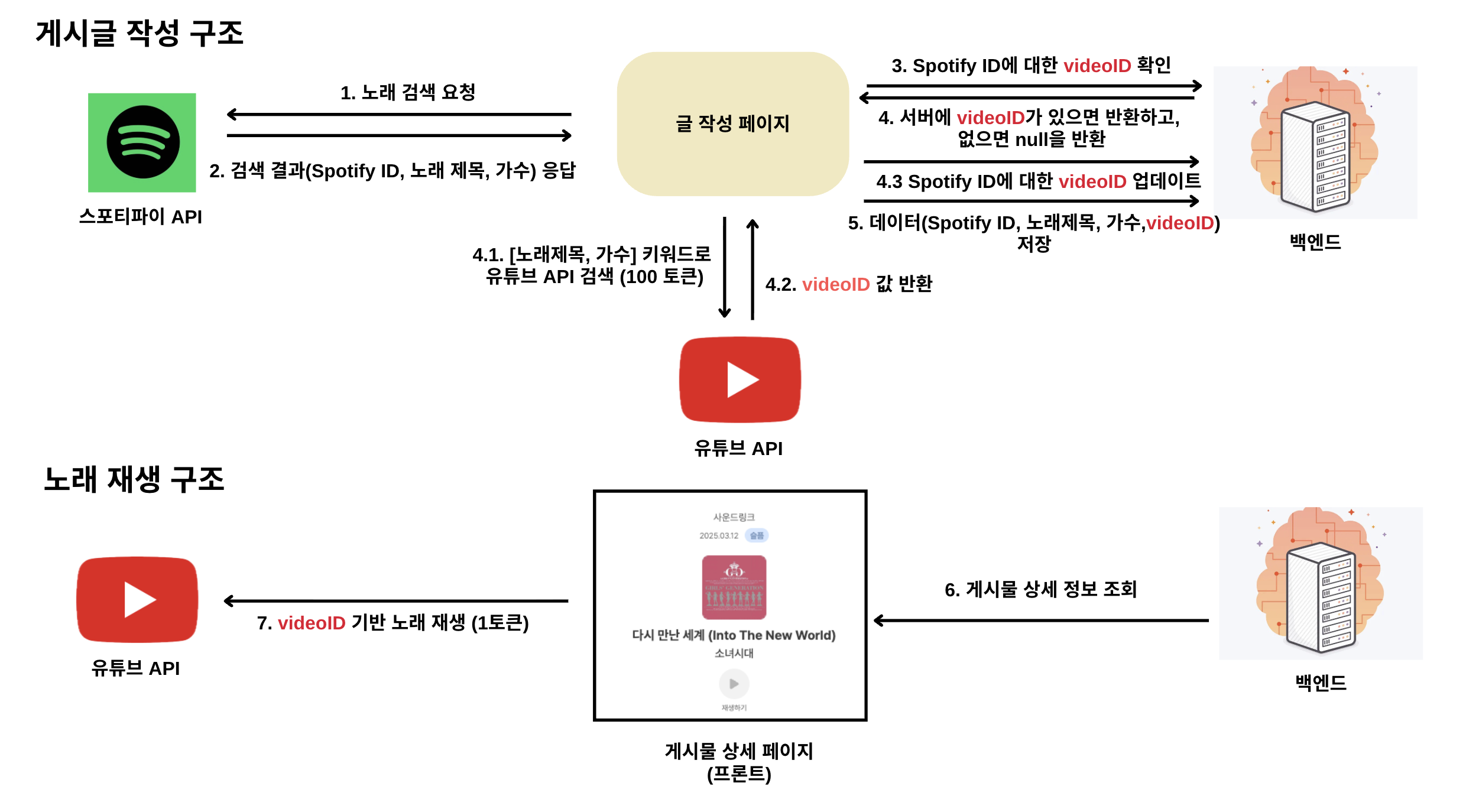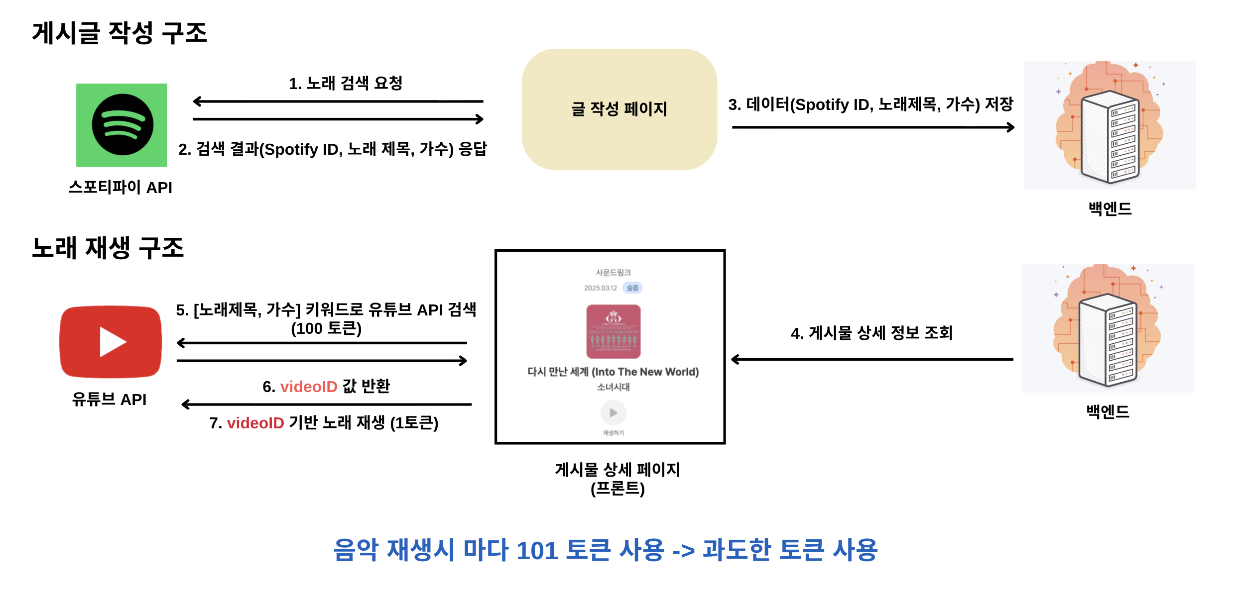 기존에는 노래 재생 시마다 YouTube 검색 요청이 발생해 100토큰이 소모되었지만, 개선 이후에는 videoID를 사전 저장하여 1토큰만으로 재생 가능한 구조로 최적화되었습니다.