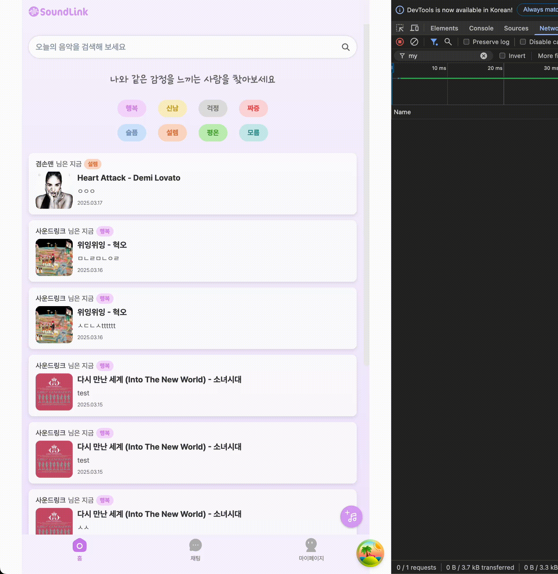 현재 마이페이지에서는 유저 API를 통해 닉네임과 프로필 뮤직을, 유저 포스트 API를 통해 게시글 데이터를 불러오고 있습니다.