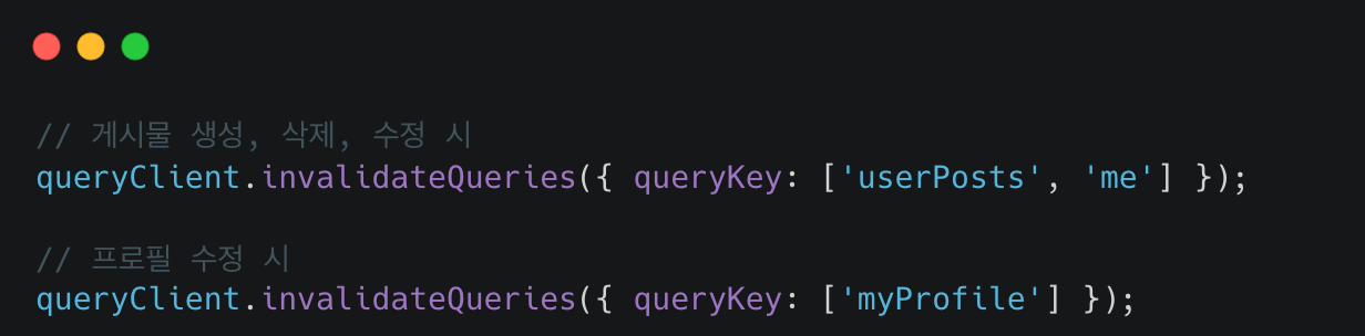 이를 해결하기 위해, 게시물 생성, 수정, 삭제 등 데이터 변경 작업이 성공적으로 완료되면 invalidateQueries