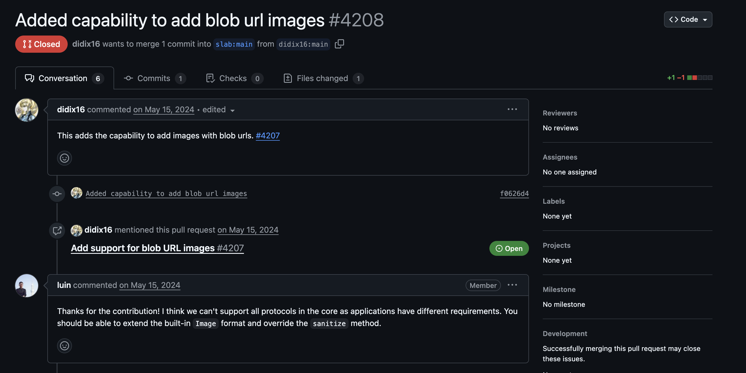 Quill 라이브러리의 공식 GitHub을 확인한 결과, Blob 형식은 기본적으로 지원하지 않아 별도의 커스터마이징이 필요하다는 것을 알 수 있었습니다.