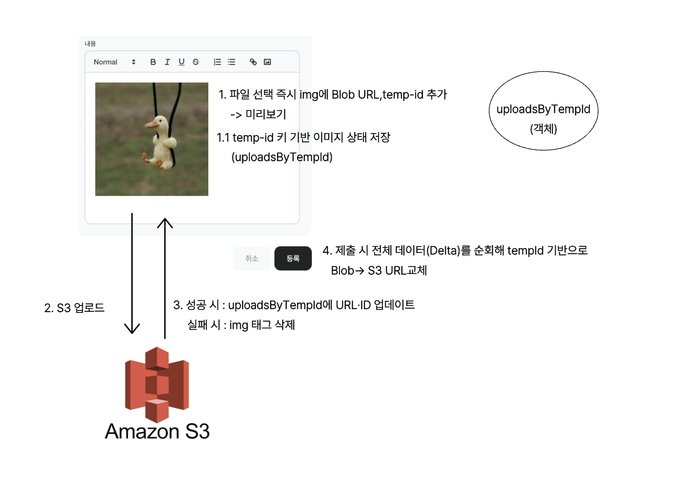 이미지 업로드부터 Blob URL을 S3 URL로 교체하기까지의 전체 구조는 다음과 같습니다.