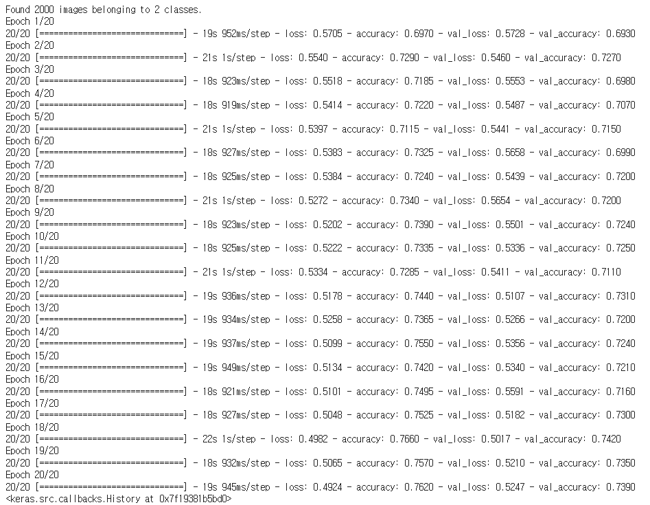 # 1. 특성추출부 전체 동결 후 분류기 학습 → 오차가 어느정도 줄어드는걸 확인