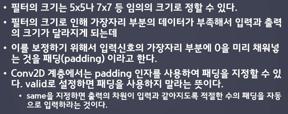 padding = 'same', # 가장자리에 0을 먼저 채우고 kernel를 계산 → 크기가 줄어들지 않음