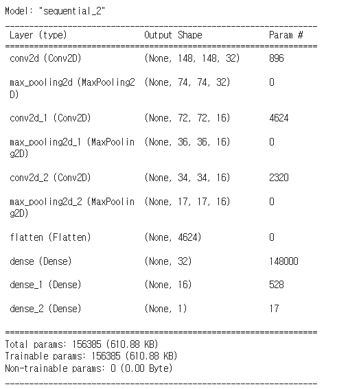 input_shape = (150, 150, 3), # 입력 데이터의 모양(RGB), 입력층 역할