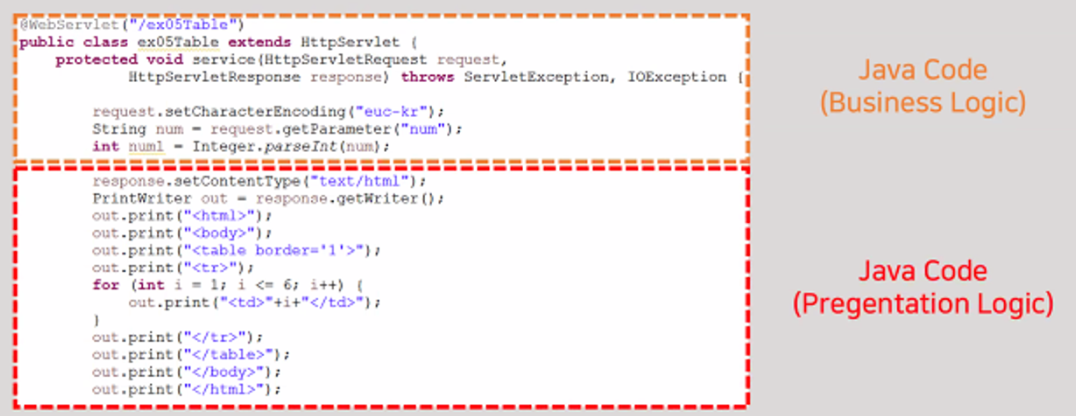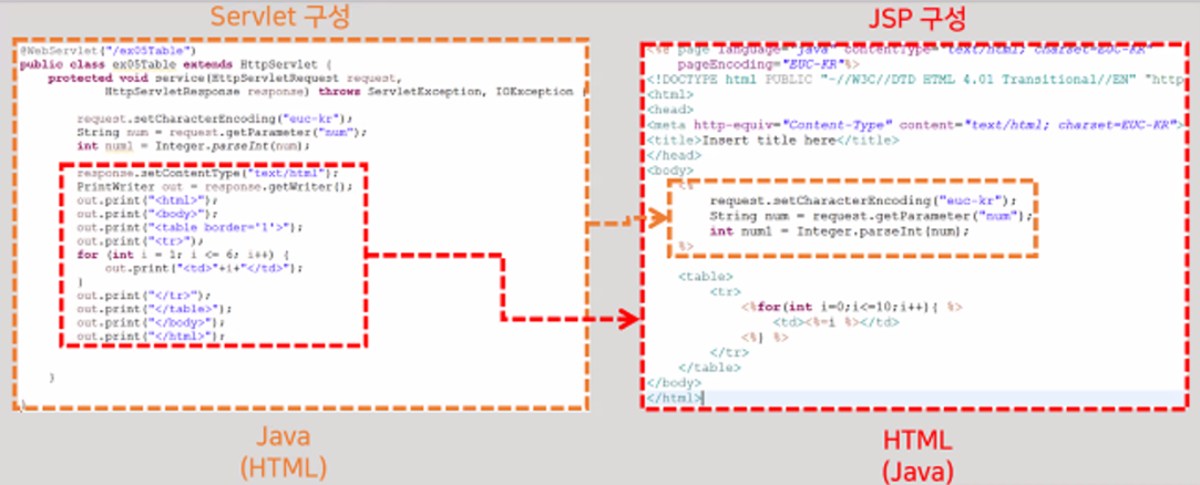 → 로직구현은 Servlet 클래스에, HTML 중심의 코드는 JSP에