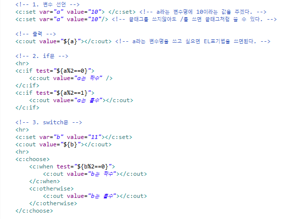 <c:set var="a" value="10"/> <!-- 끝태그를 쓰지않아도 /를 쓰면 끝태그처럼 쓸 수 있다. -->