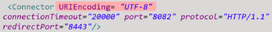 server.xml파일의 63번째줄 Connector 태그에 URIEncoding="인코딩방식" 속성 추가