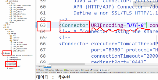 // GET방식 디코딩 방법 : server.xml파일의 63번째줄 Connector 태그에