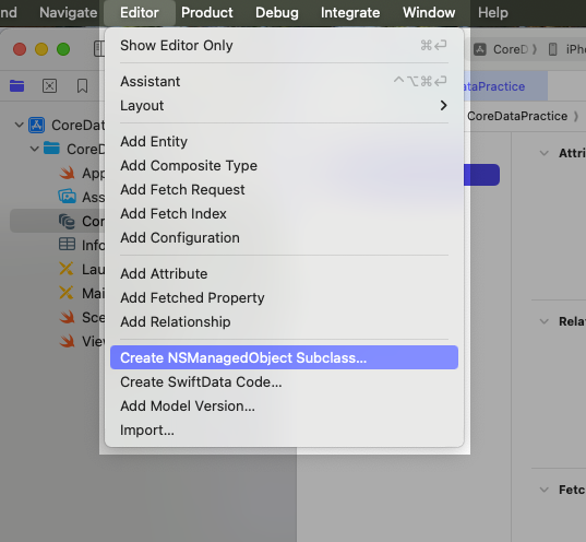 Editor → Create NSManagedObject Subclass를 클릭해서 코드 생성