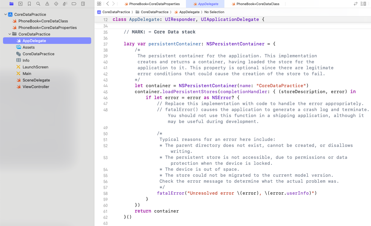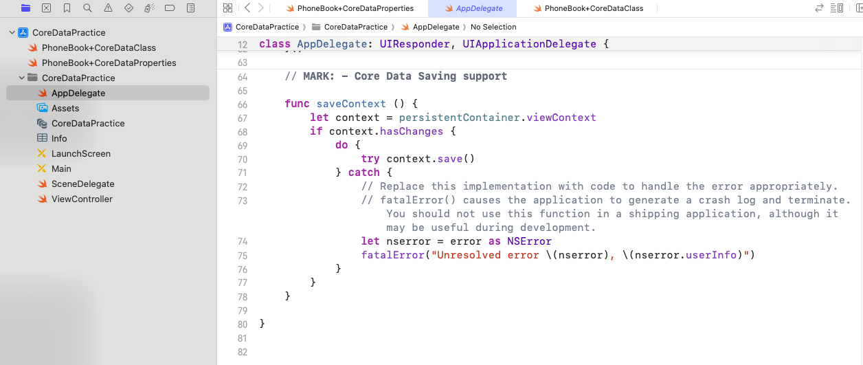 프로젝트 생성시 CoreData를 체크해줬기 때문에 AppDelegate.swift 에 코드가 자동으로 세팅됨