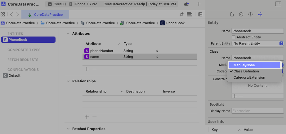 Manual/None : Entity의 서브클래스를 개발자가 작성Class Definition : Entity의 서브클래스를 자동으로 작성Category/Extension : Entity 클래스 + extension 파일 생성import Foundation