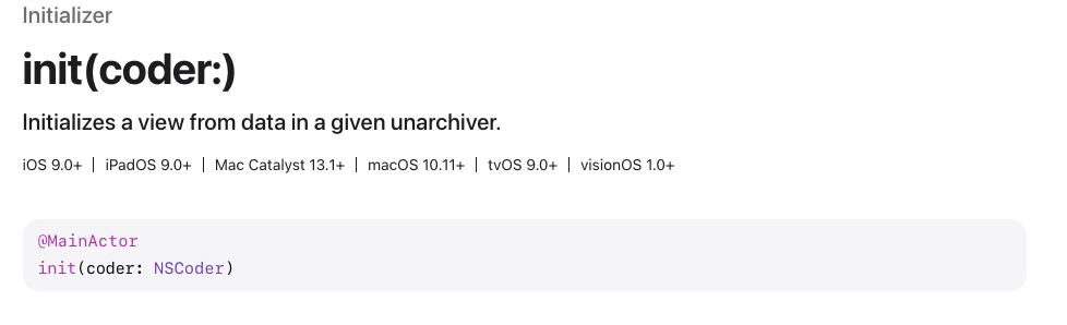 이에따라 init(coder:)가 어떤 용도인지 간략히 생각해본다면 '직렬화된 데이터를 사용해서 뷰 컨트롤러 또는 뷰를 초기화 한다' 정도로 추측할 수 있겠다.