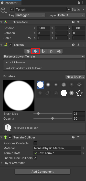 지면의 높낮이를 설정하기 위해 Inspector창에서 Paint Terrain도구를 선택한다.