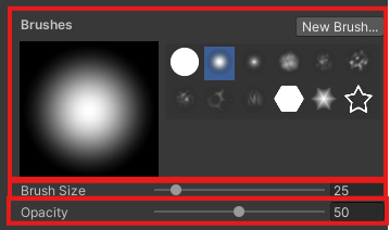 브러시의 종류, 굵기, 효과의 강도를 Inspector 창에서 바꿀 수 있다.