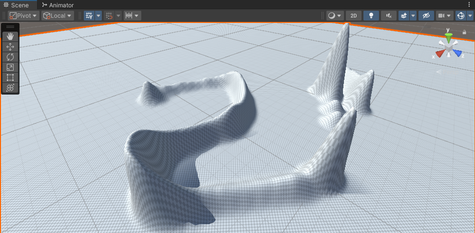 Scene뷰에서 마우스 포인터를 올리면 파란색 동그라미가 나타나고, 이 동그라미가 지면을 올라오게 하는 범위가 된다.