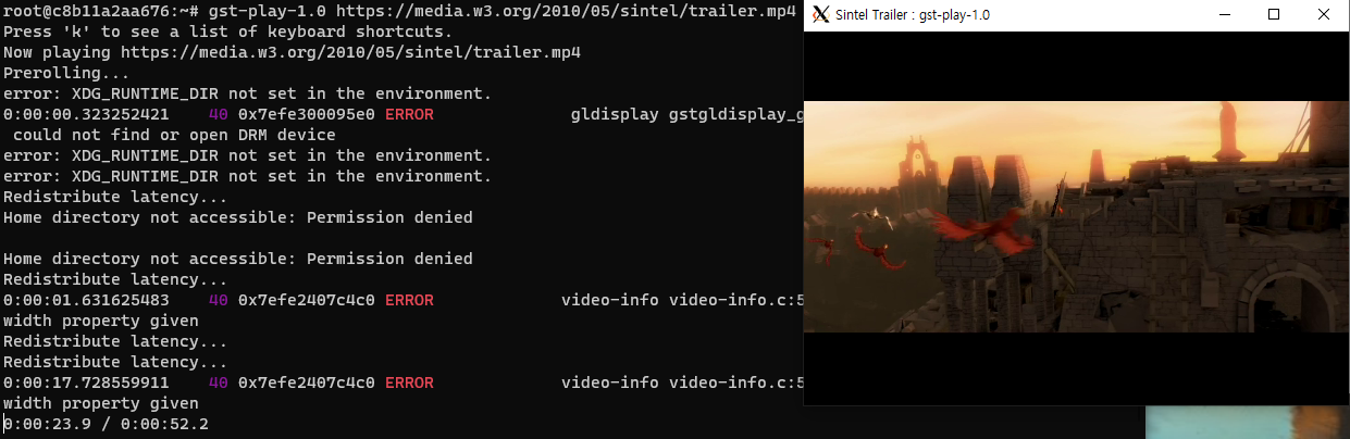 이전 글에서 만든 gst-play-1.0으로 video 영상이 출력되지 않는 container는 버리고 $DISPLAY parameter를 가지는 새로운 container를 시작하겠습니다.