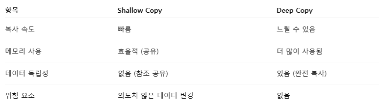 Shallow Copy는 빠르고 메모리를 적게 쓰지만, 의도치 않은 공유가 위험할 수 있다.