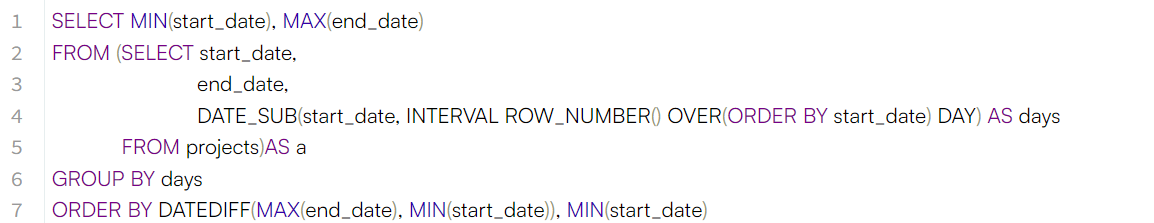 days컬럼을 생성하여 인라인뷰 a로 사용, days는 시작일에서 row넘버를 뺀 날짜, 연속된 프로젝트의 경우 days가 같아진다.