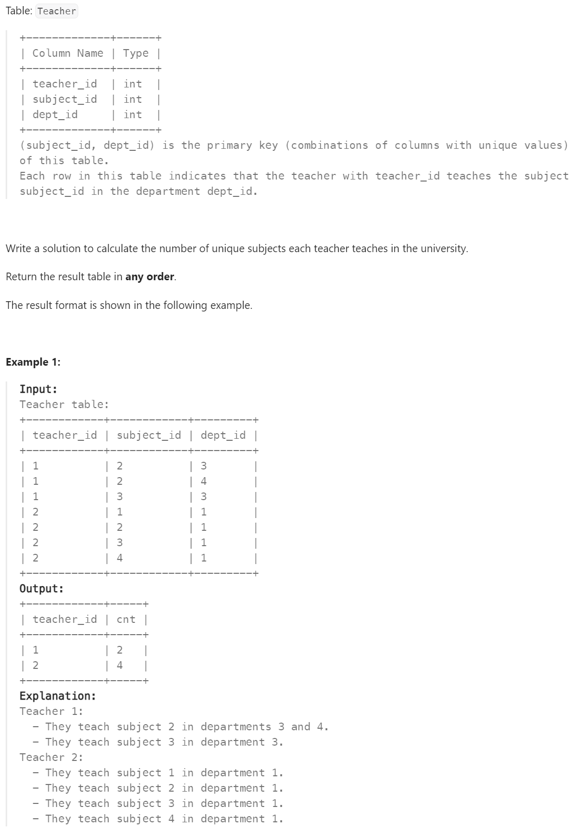 https://leetcode.com/problems/number-of-unique-subjects-taught-by-each-teacher/description/
