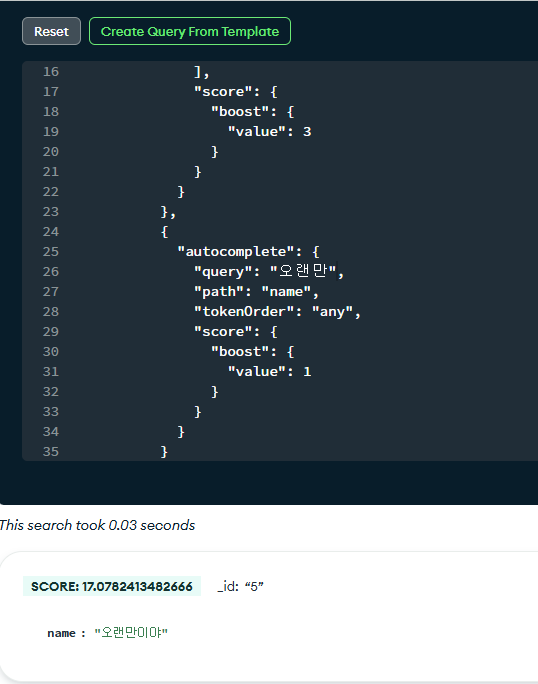 두 조건은 compound의 should로 묶어 둘 중 하나만 만족해도 검색되도록 구성하고, 각각 score.boost를 달리 설정했다.