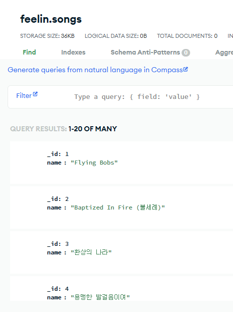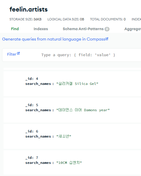 나는 ObjectId의 고유성, 생성시간 정보가 필요하지 않고, 여러 테이블을 한 컬렉션에 섞어 저장할 계획도 없기 때문에, _id에 MySQL의 artists.id나 songs.id를 그대로 넣는 구조를 선택했다.