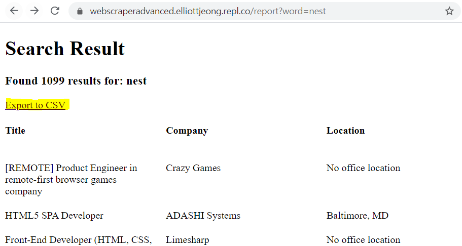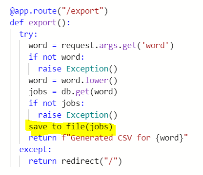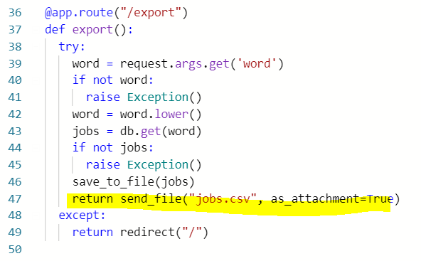 : flask에서 send_file function을 다운 받아준 후, export function의 return으로 send_file 해주면, 원하는 내용이 담긴 "jobs.csv" 파일이 다운로드된다.