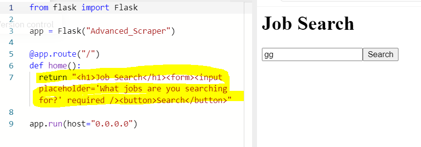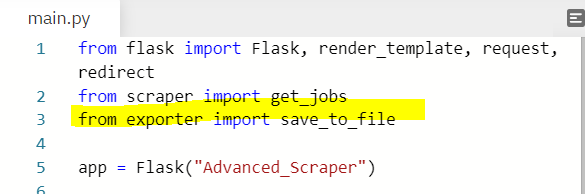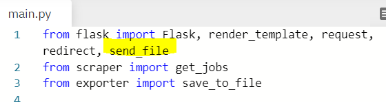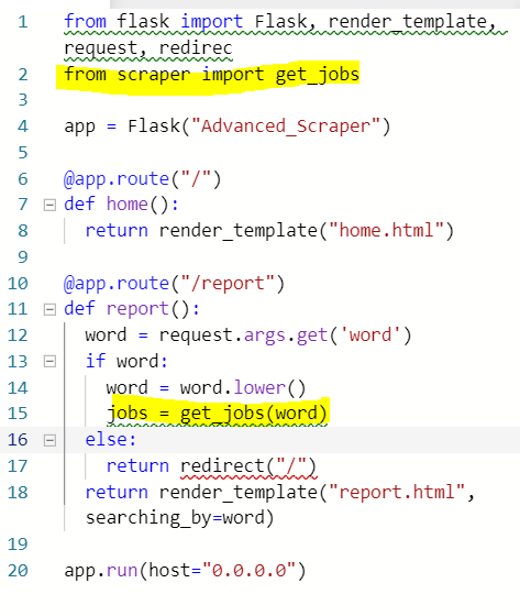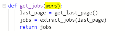 2) from scraper에서 imprt get_jobs 함수를 불러와 주고, if word가 존재할시, jobs라는 변수에 get_jobs(word)가 저장되도록 한다.