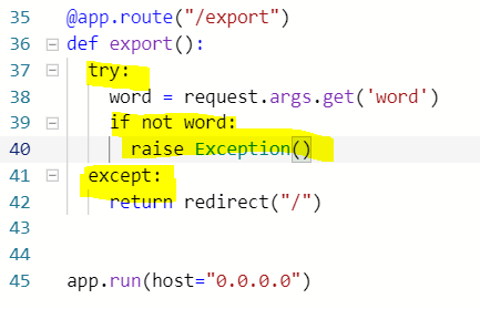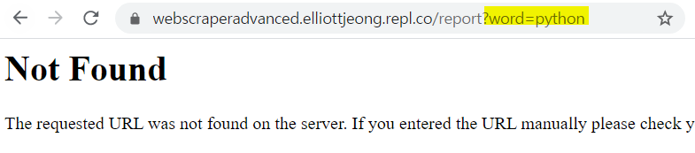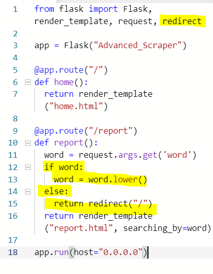 만약 링크에 ?word=keyword가 존재하지 않는 "https://webscraperadvanced.elliottjeong.repl.co/report" 이런 상태라면 위와 같은 코드로는 "You are looking for"만 출력되게 된다. However, what we want is to redirect users to the home page when nothing is searched.