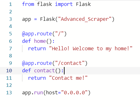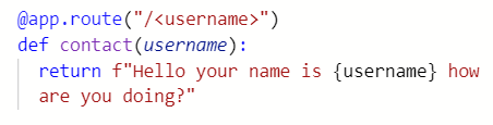 2) Flask를 import 해주고 아래와 같은 코드를 작성해준다. @는 decorator로 데코레이터는 바로 아래 있는 함수를 찾아 그 함수를 꾸며주는 역할을 한다. So as soon as Python sees a code like below, python knows that if somebody goes to "/contact", we want to execute the function under that decorator. Because decorators look for functions, if it's not a function under a decorator, I will get an error.