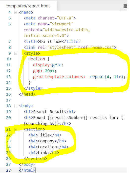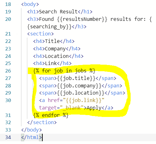 2) scraping한 잡들을 해당 grid에 넣어 보여주고 싶다면? 31번째 줄과 같이 추출된 jobs들을 html에 보내줄 수 있도록 render_template에 jobs=jobs를 해준다.