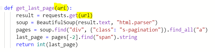 4) last_page 값을 get한 후, extract_jobs 함수가 실행되는데, 이 역시 url을 요구하므로 수정을 해줘야 한다. extract_jobs란 함수가 두 개의 인자를 가질 수 있도록.