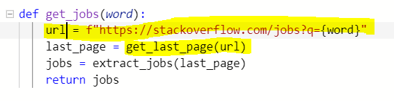 3) get_jobs(word)이 부른 get_last_page(word)가 다음과 같이 url에 정보를 request할 것이므로, URL은 맨 상단이 아닌 get_jobs(word) 안으로 옮겨와 키워드가 들어갈 란을 {word}로 바꿔줘야 한다.